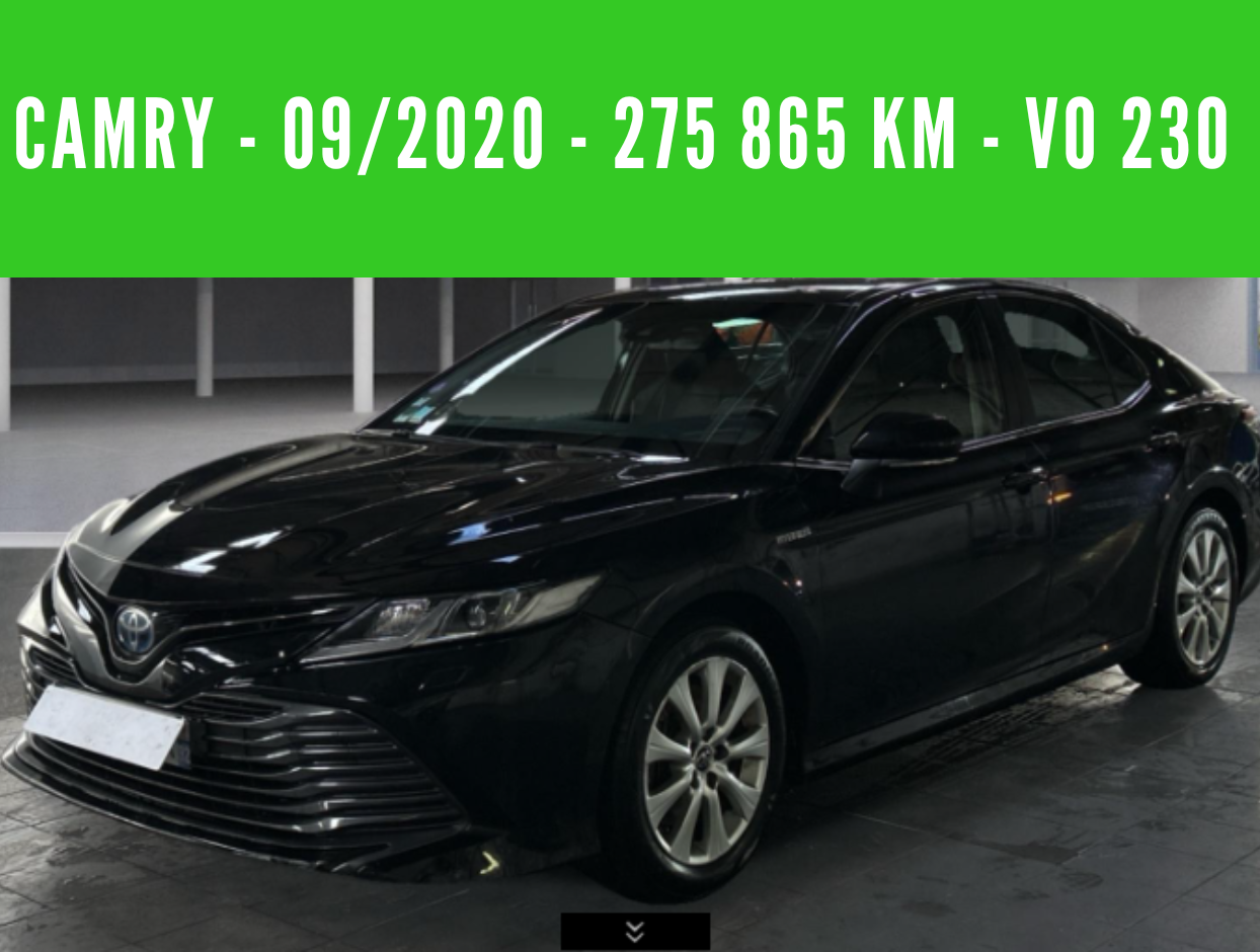CARENTS vous propose en vente cette magnifique CAMRY HYBRIDE PRO  218 CH 2WD DYNAMIC BUSINESS BOITE AUTO 09/2020 – 275 865 km – TVA récupérable – 1 ère MAIN – VO 230